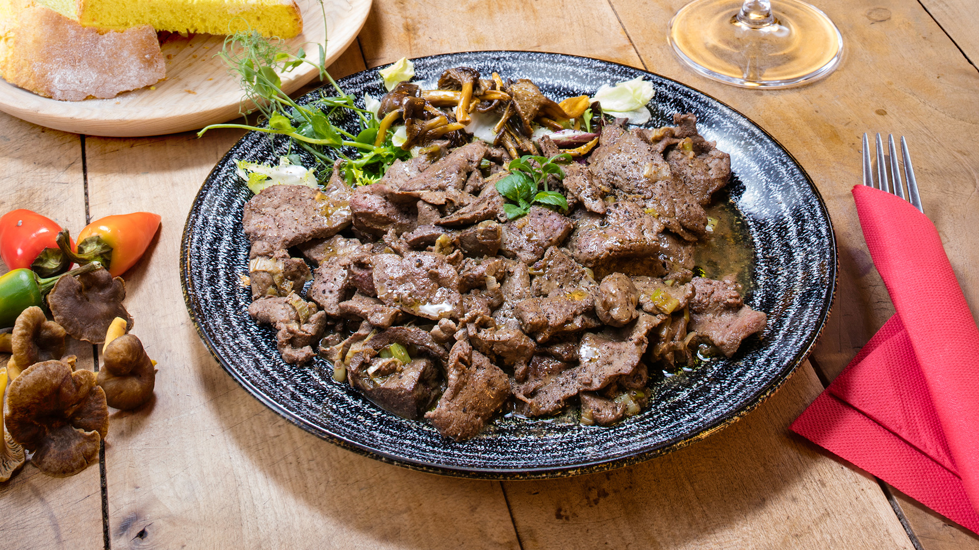 V ponvi na olivnem olju prepražite mlado čebulico in takoj zatem dodajte dobro pest svežih, na tanko narezanih mladogovelih jetrc. Na močnem ognju jih mešajte toliko časa, da enakomerno porjavijo. Zalijete jih z vinjakom, da alkohol lepo “zagori”, posolite, popoprate in še vroče s kruhom pomažete.