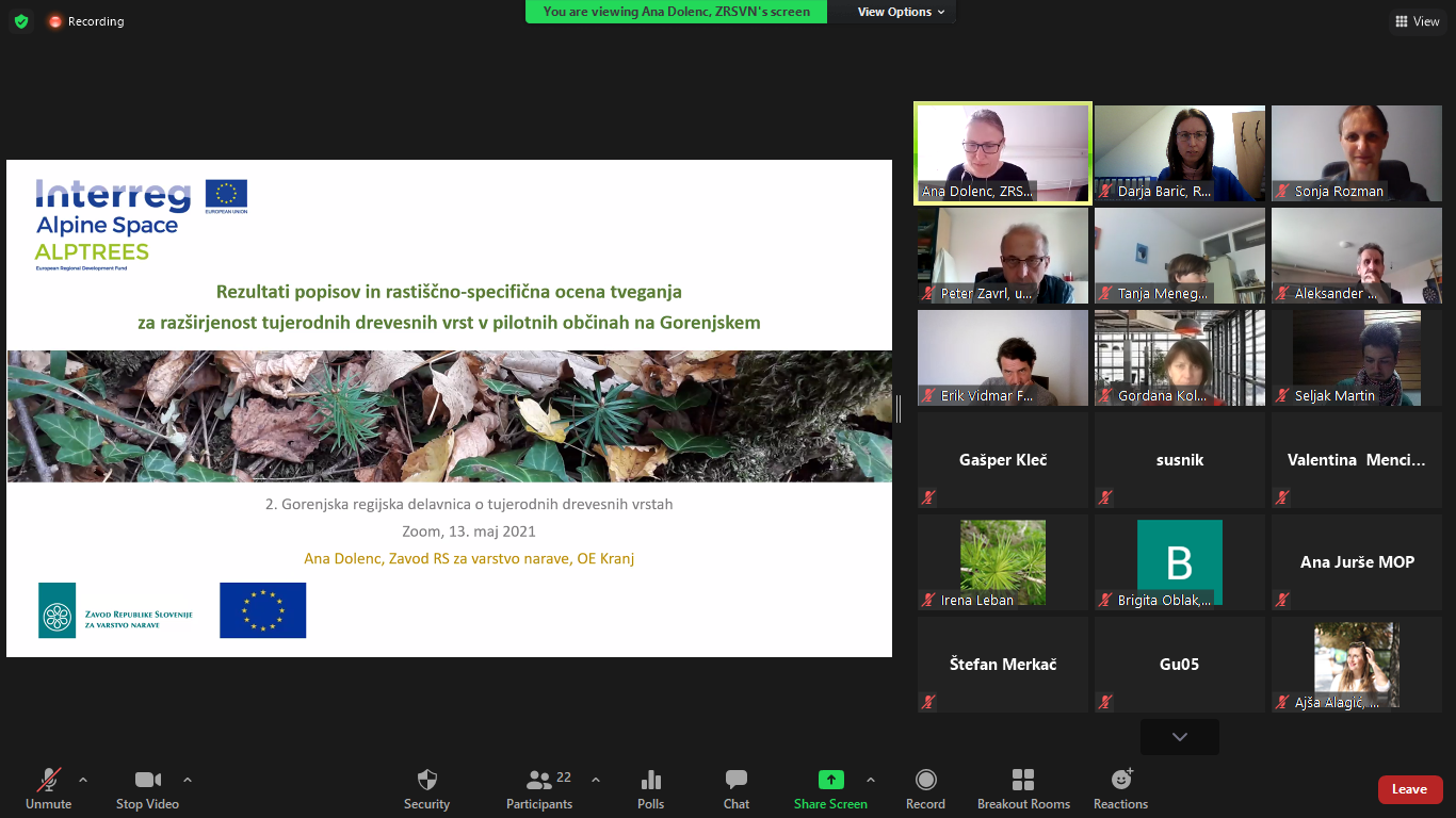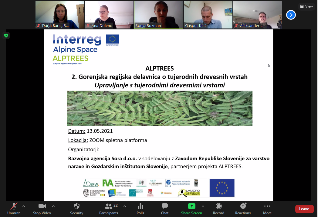 Včeraj, 13. 05. 2021, ob 09:15 uri, je Razvojna agencija Sora d. o. o. v sodelovanju z Zavodom Republike Slovenije za varstvo narave in Gozdarskim inštitutom Slovenije, izvedla preko spleta ALPTREES 2. Gorenjsko regijsko delavnico o tujerodnih drevesnih vrstah.