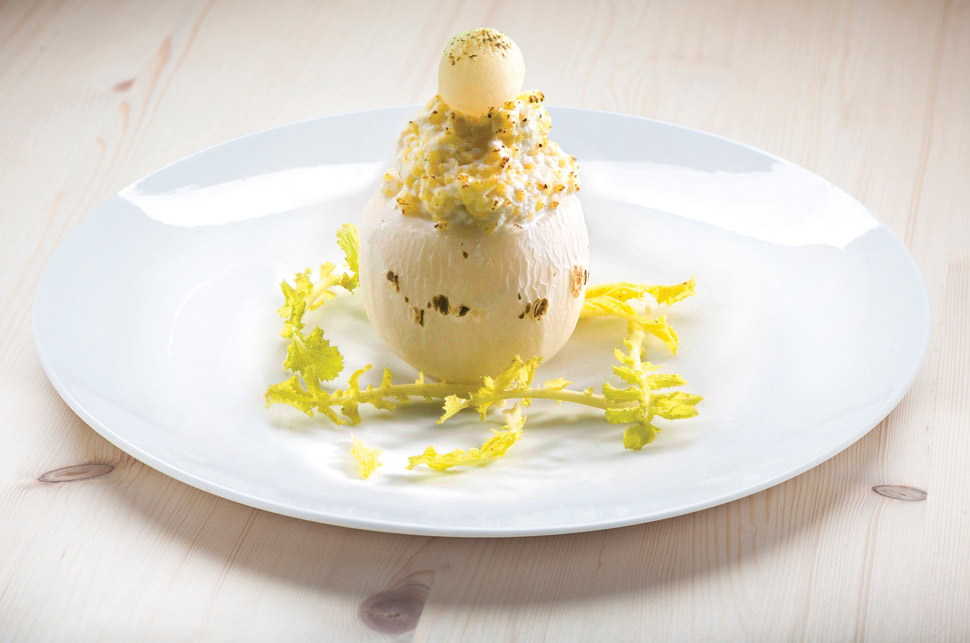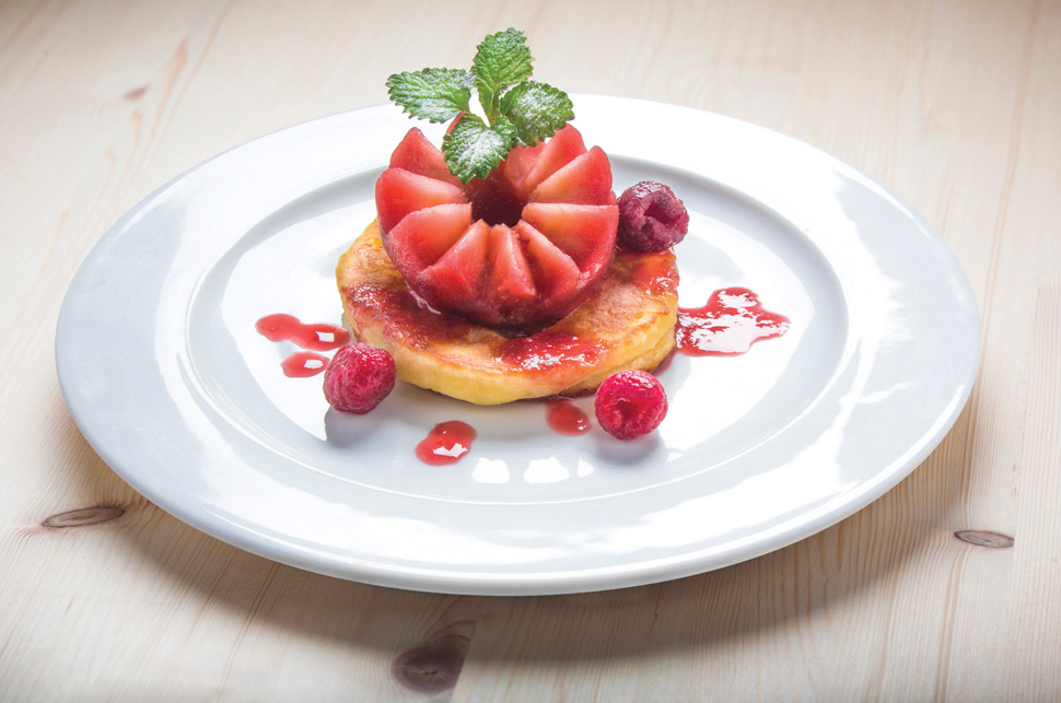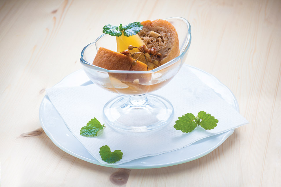 Jabolka so bila ena redkih vrst sadja, ki ga na podeželju ni primanjkovalo. Od spomladi do jeseni iz svežih, pozimi pa iz posušenih, so pripravljali številne jedi in pijače. Ena izmed jedi, ki je bila na Loškem pogosto na mizi, so bila tudi dušena jabolka. Tako kot nekoč, ko so jedi pogosto bogatili z gozdnimi sadeži, smo tudi mi jabolka skuhali v malinovi omaki in jim dali osvežujoč okus ter podložili z obročkom, narejenim iz domače skute. Ob slastni sladici zagotovo ne boste ostali ravnodušni.