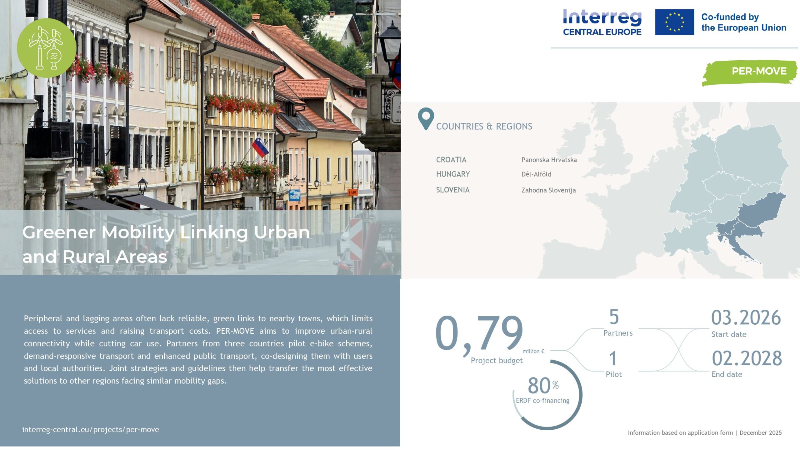 Projekt PER-MOVE si prizadeva izboljšati povezljivost med mestom in podeželjem ter zmanjšati uporabo avtomobilov. Partnerji iz treh držav preizkušajo sheme e-koles, prevoz na zahtevo ter izboljšan javni prevoz, pri čemer te rešitve sooblikujejo skupaj z uporabniki in lokalnimi oblastmi. Skupne strategije in smernice nato omogočajo prenos najučinkovitejših rešitev tudi v druge regije, ki se soočajo s podobnimi izzivi na področju mobilnosti.