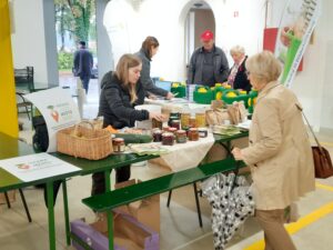 Obiskovalci Tržnice Škofja Loka so toplo pozdravili Zero Waste akcijo in se takoj odzvali z dobrotami, pripravljenimi doma in jih prinesli na izmenjavo k nam na stojnico. Na stojnici se je hitro našlo nekaj za vsakega obiskovalca: vložene kumarice, stročji fižol, kozarci domače marmelade – slivova, malinova, marelična – kozarci domačega kompota, ajvarja, tudi dobrote iz vrtov – bučke, krompir, jesenska buča; ob stojnici pa so obiskovalci lahko poskusili tudi staro sorto jabolk »kosmač« in pa okusno domače grozdje.